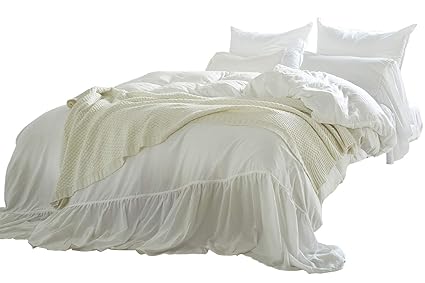 Couturebridal Shabby Chic Duvet Cover Queen White Washed Cotton Ruched Mermaid Tail French Country Bedding Set Bohemian Luxury Soft Comforter Cover