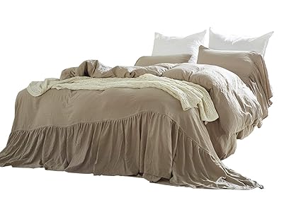 Couturebridal Shabby Chic Duvet Cover Queen Khaki Washed Cotton Ruched Mermaid Tail French Country Bedding Set Bohemian Luxury Soft Comforter Cover